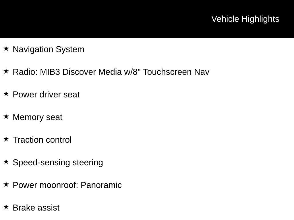 Titan Black w/V-Tex Leatherette Seat Trim, Brake assist, Electronic Stability Control, Exterior Parking Camera Rear, Memory seat, Navigation System, Power driver seat, Power moonroof: Panoramic, Radio: MIB3 Discover Media w/8" Touchscreen Nav, Speed control, Speed-sensing steering, Traction control, Wheels: 17" 2-Tone Machined Alloy.