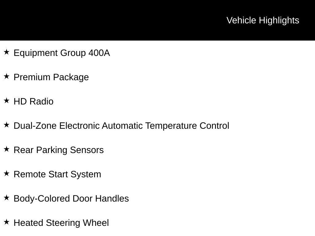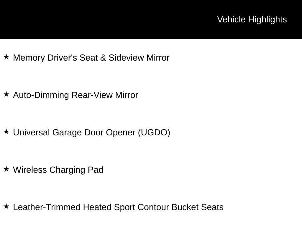 Auto-Dimming Rear-View Mirror, Body-Colored Door Handles, Dual-Zone Electronic Automatic Temperature Control, Equipment Group 400A, HD Radio, Heated Steering Wheel, Leather-Trimmed Heated Sport Contour Bucket Seats, Memory Driver's Seat & Sideview Mirror, Premium Package, Rear Parking Sensors, Remote Start System, Universal Garage Door Opener (UGDO), Wireless Charging Pad.