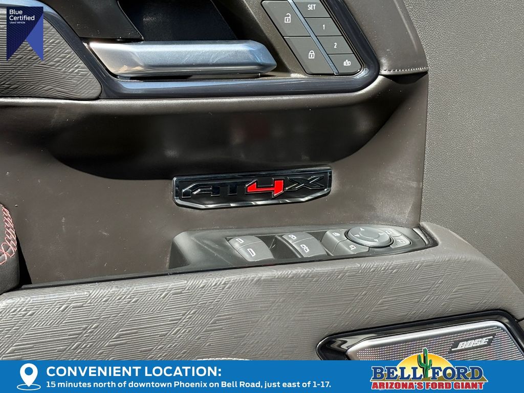 The interior of this Sierra 1500 AT4X is equally impressive, featuring premium leather seating, heated and ventilated front seats, a Bose Premium audio system, and a host of advanced technology features. The Heads-Up Display, 12-Speaker Bose sound system, and wireless charging capabilities elevate the driving experience.