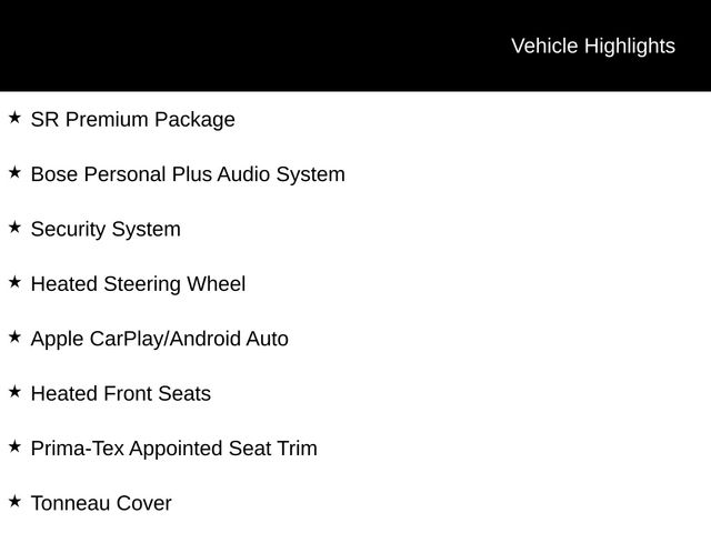 Apple CarPlay/Android Auto, Bose Personal Plus Audio System, Heated Front Seats, Heated Steering Wheel, Prima-Tex Appointed Seat Trim, Security System, SR Premium Package, Tonneau Cover.